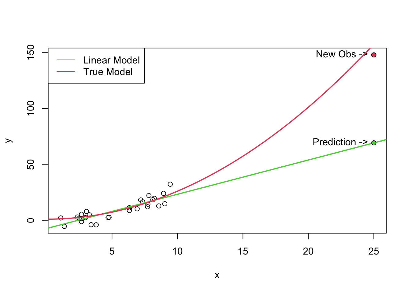 In the plot below, the black dots are the original data, and we’re trying to predict a new value at \(x = 25\). The red line is the true model that I generated the data from. The black line represents a linear model. This model fits the original data quite well13, but predictions are completely inappropriate for values outside the data.