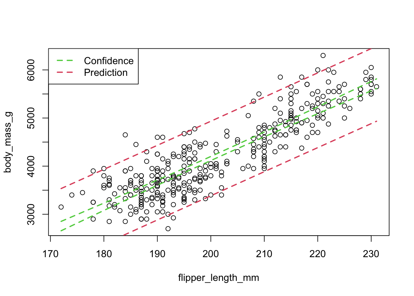 library(palmerpenguins)penguins <- penguins[complete.cases(penguins),]peng_lm <-lm(body_mass_g ~ flipper_length_mm, data = penguins)# confidence intervals along all flipper lengthsflippers <-seq(from =min(penguins$flipper_length_mm),to =max(penguins$flipper_length_mm), length.out =100)confi <-predict(peng_lm, newdata =data.frame(flipper_length_mm = flippers), interval ="confidence")predi <-predict(peng_lm, newdata =data.frame(flipper_length_mm = flippers), interval ="prediction")plot(body_mass_g ~ flipper_length_mm, data = penguins)lines(x = flippers, y = confi[, "upr"], col =3, lwd =2, lty =2)lines(x = flippers, y = confi[, "lwr"], col =3, lwd =2, lty =2)lines(x = flippers, y = predi[, "upr"], col =2, lwd =2, lty =2)lines(x = flippers, y = predi[, "lwr"], col =2, lwd =2, lty =2)legend("topleft", legend =c("Confidence", "Prediction"), col =3:2, lwd =2, lty =2)