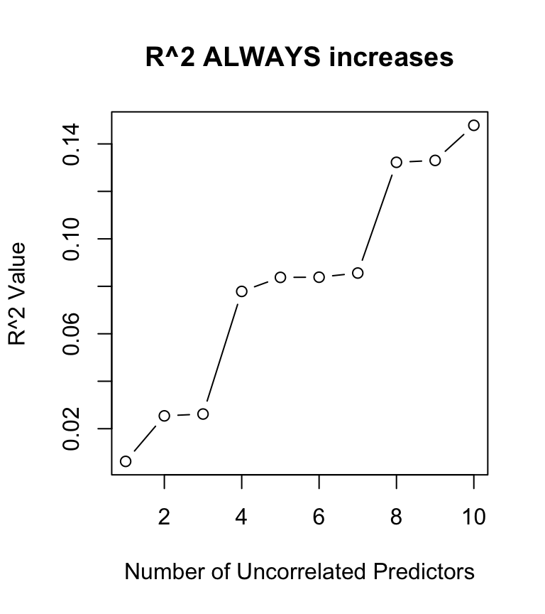 nx <-10# Number of uncorrelated predictoresuncorr <-matrix(rnorm(50*(nx +1)), nrow =50, ncol = nx +1)## First column is y, rest are xcolnames(uncorr) <-c("y", paste0("x", 1:nx))uncorr <-as.data.frame(uncorr)rsquares <-NAfor (i in2:(nx +1)) { rsquares <-c(rsquares,summary(lm(y ~ ., data = uncorr[,1:i]))$r.squared)}plot(1:10, rsquares[-1], type ="b",xlab ="Number of Uncorrelated Predictors",ylab ="R^2 Value",main ="R^2 ALWAYS increases")
