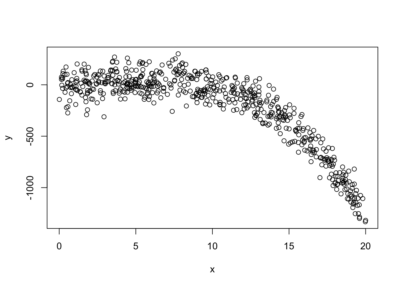 y <- 2 - 3*x + 3*x^2 - 0.3*x^3 + rnorm(600, 0, 100)
