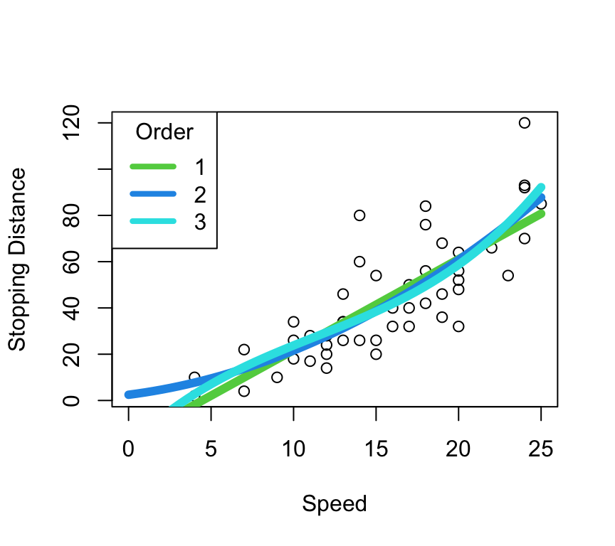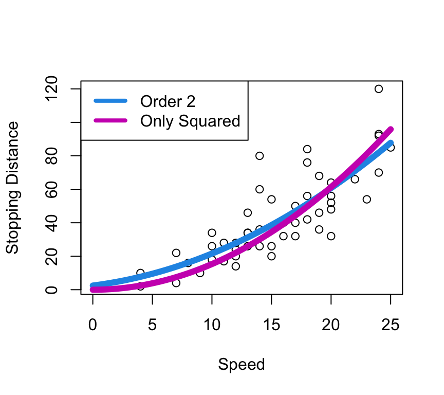 x3 = cars$speed^3, x4 = cars$speed^4)