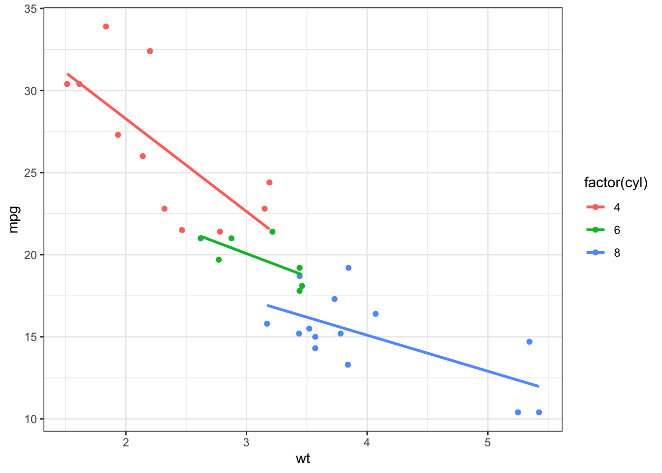 A polynomial model is not the best model here! The following plot shows three related linear models (which we’ll learn about later), demonstrating that it is linear but there’s a hidden grouping!