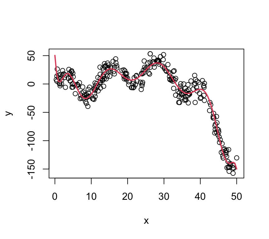 The twist: The fitted line is just a polynomial model: \(y = \beta_0 + \sum_{j=1}^{12}\beta_jx^j\)