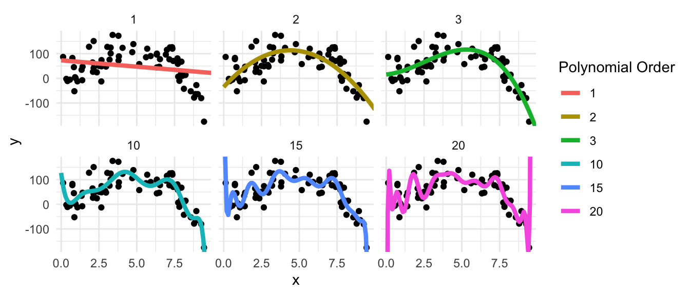 To fit a polynomial of order \(k\): \[ y = \beta_0 + \sum_{j=1}^{k}\beta_jx^j + \epsilon \] we can simply fit a linear model to transformed predictors, i.e.: \[ x_1 = x;\; x_2 = x^2;\; x_3 = x^3;\;... \] and we can just fit a linear model as usual!