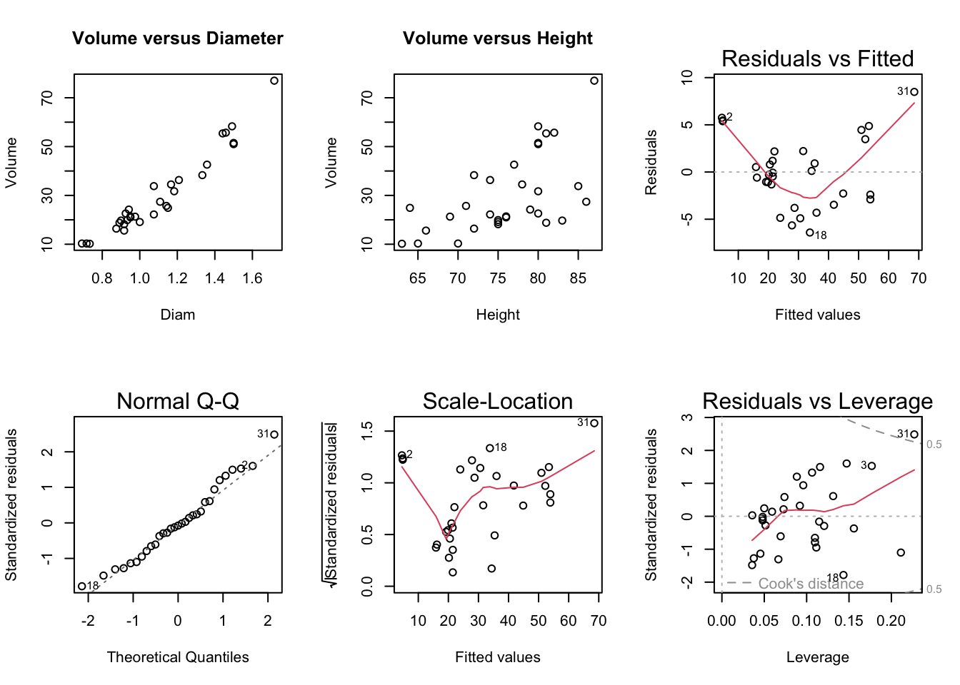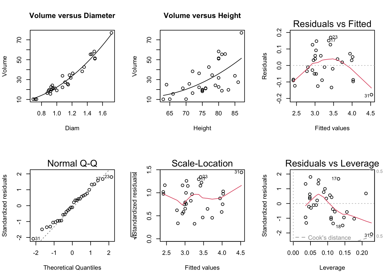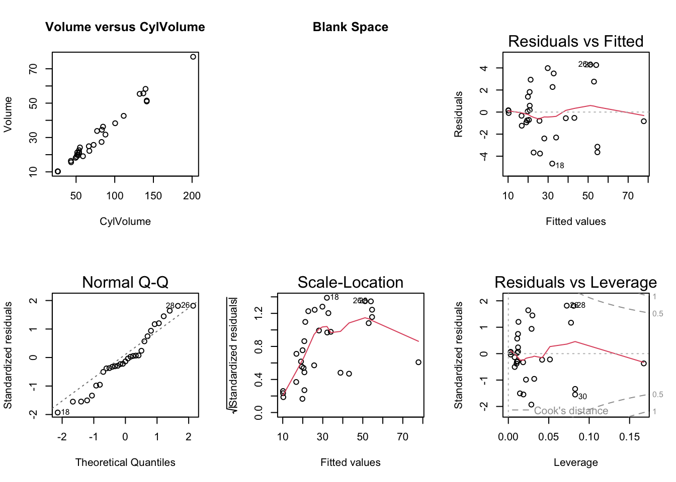 par(mfrow =c(2, 3))plot(Volume ~ CylVolume, data = trees,main ="Volume versus CylVolume")plot(1, main ="Blank Space", bty ="n", xaxt ="n", yaxt ="n",xlab ="", ylab ="", pch ="")plot(cyl_lm)