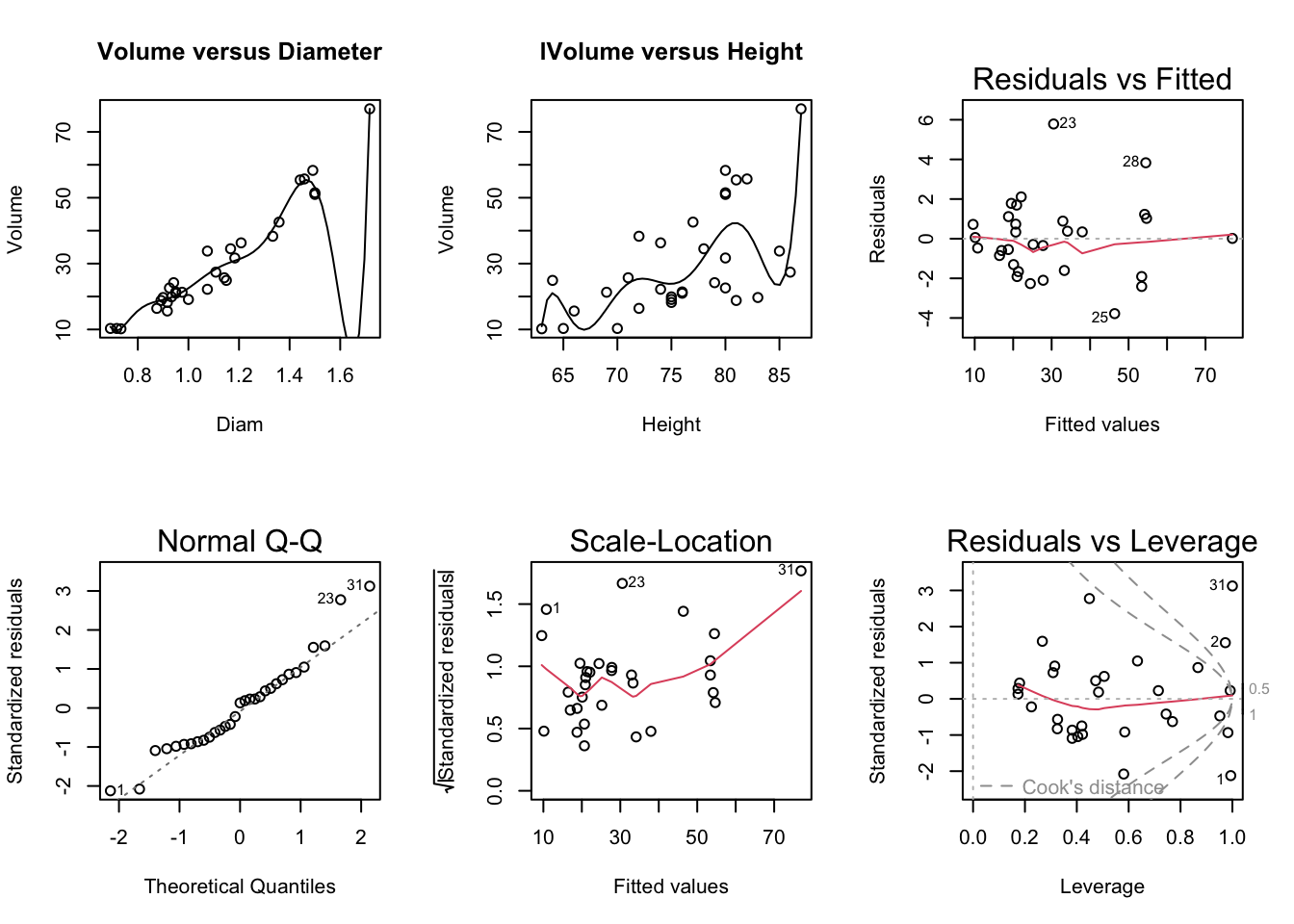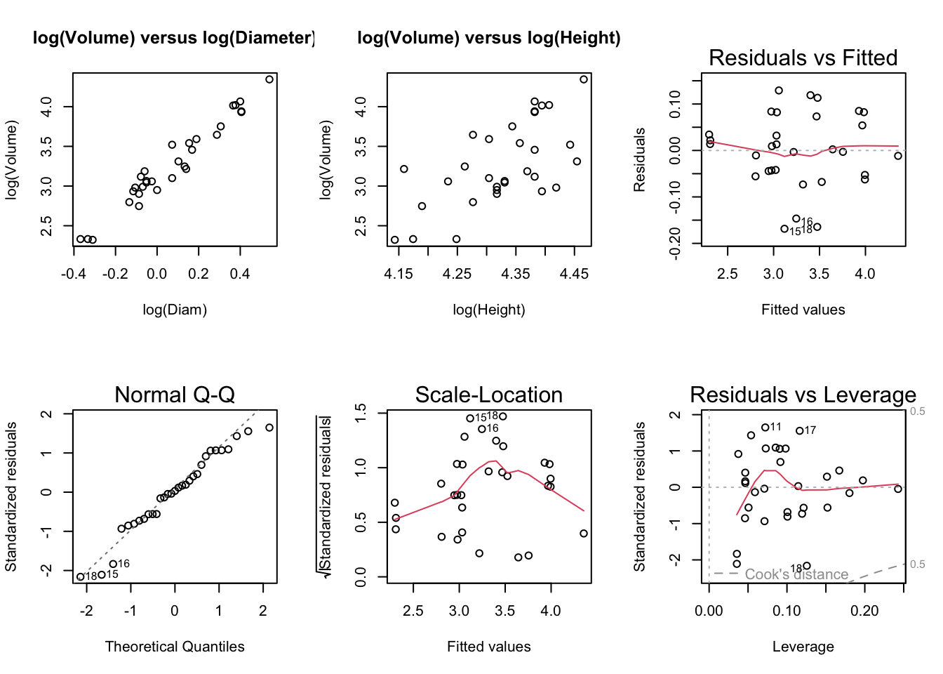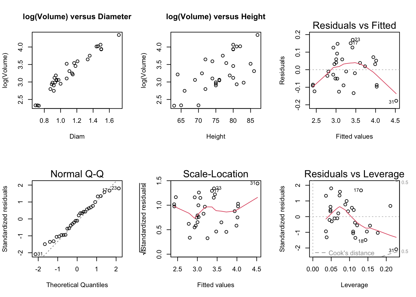 par(mfrow =c(2, 3))plot(Volume ~ CylVolume, data = trees,main ="Volume versus CylVolume")plot(1, main ="Blank Space", bty ="n", xaxt ="n", yaxt ="n",xlab ="", ylab ="", pch ="")plot(cyl_lm)