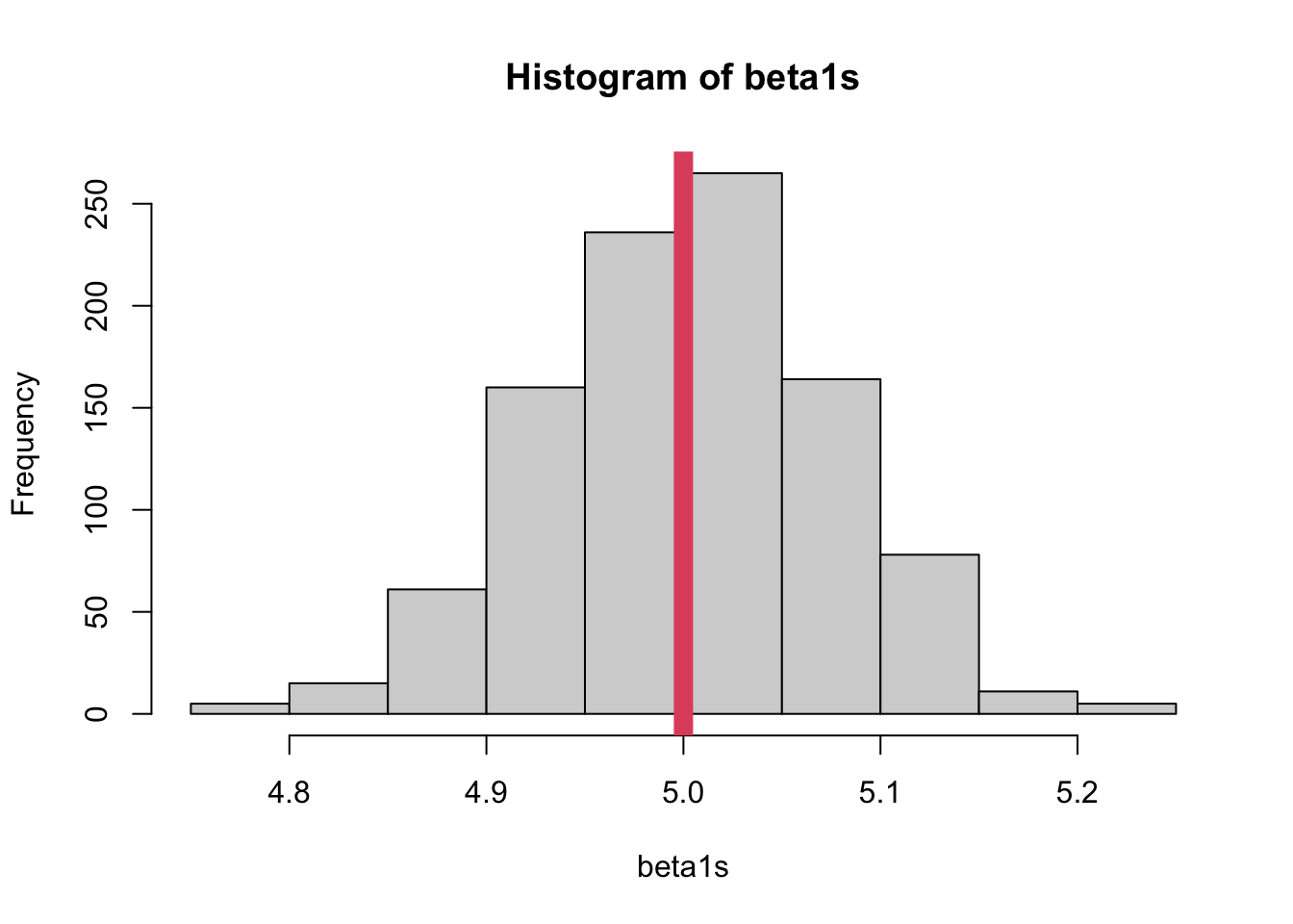 hist(beta1s)abline(v =5, col =2, lwd =10) # true value of beta