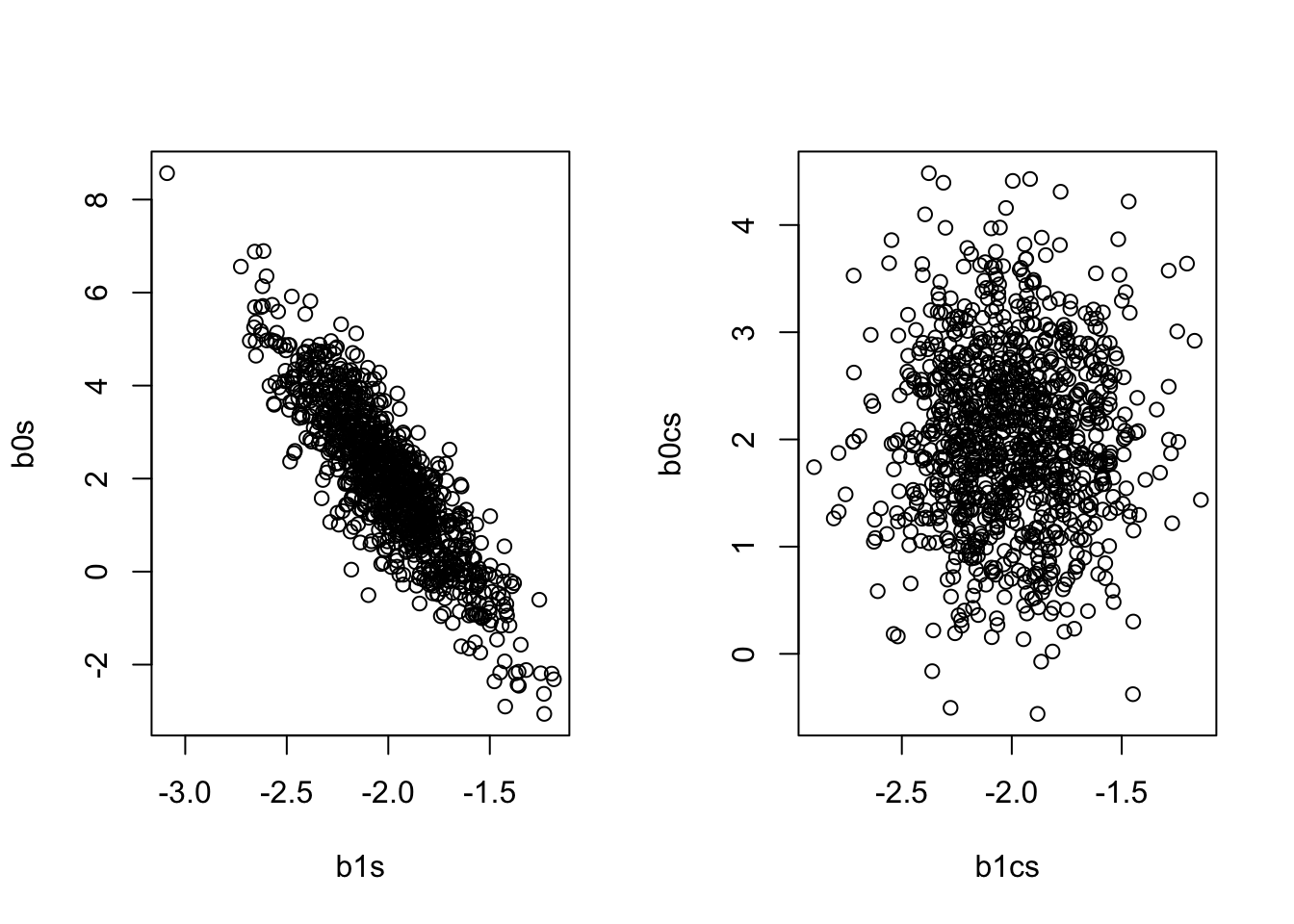 It also records the estimates based on centering\(\underline x\). Notice how the formula for \(\hat\beta_0\) is no longer dependent on \(\hat\beta_1\) if the mean of \(\underline x\) is 0!