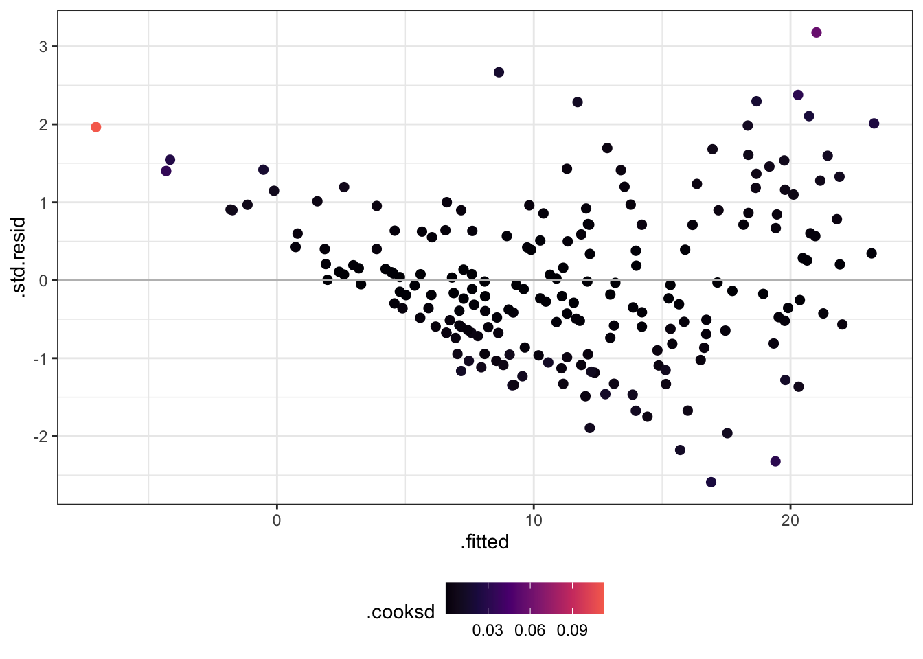 aes (x = .fitted, y = .std.resid, col = .cooksd) +