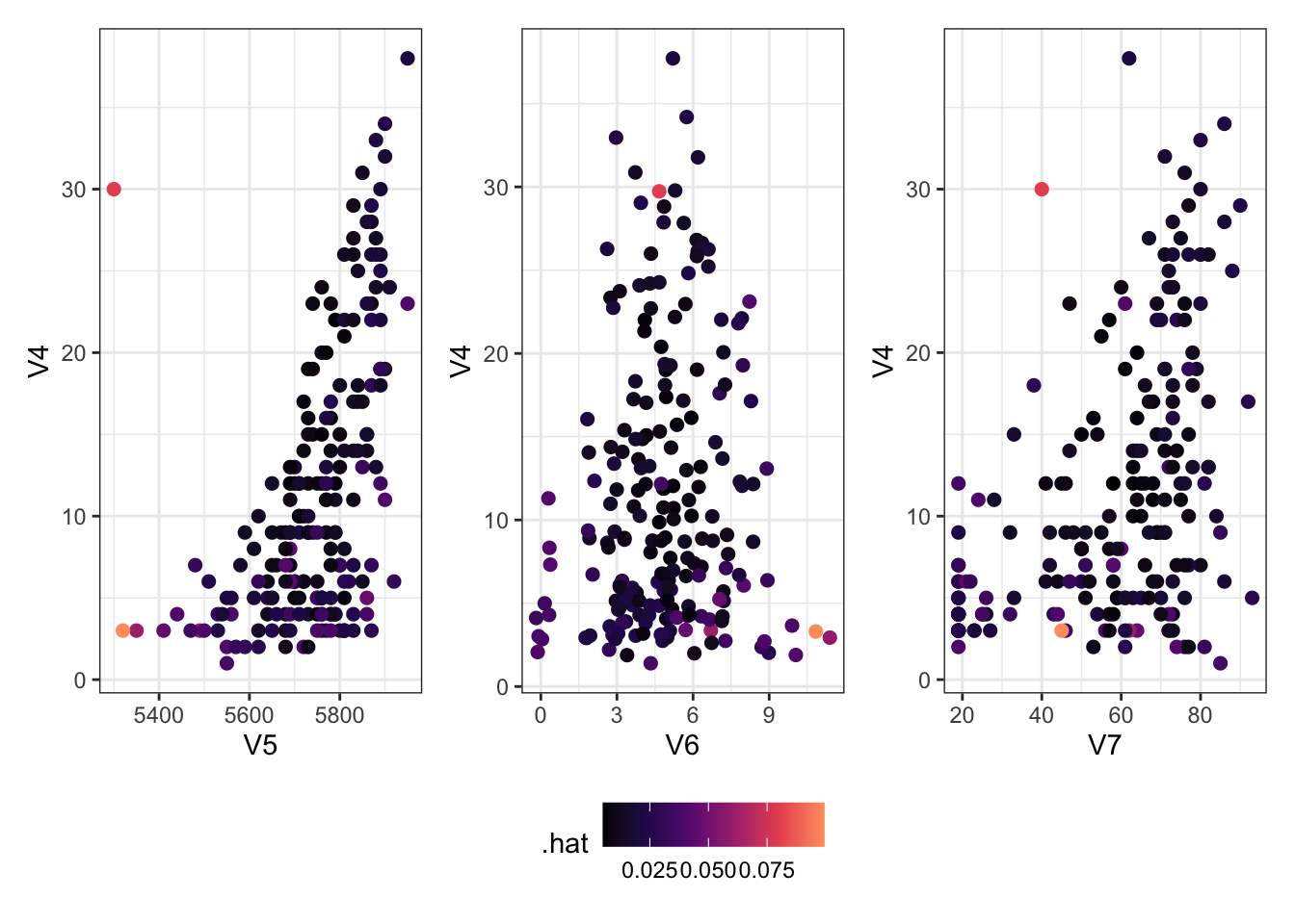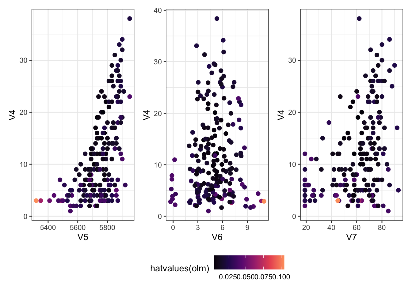aes (x = V5, y = V4, col = hatvalues (olm)) +
