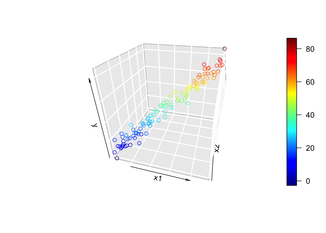scatter3D(x1, x2, y, phi = 30, theta = 15, bty = "g",