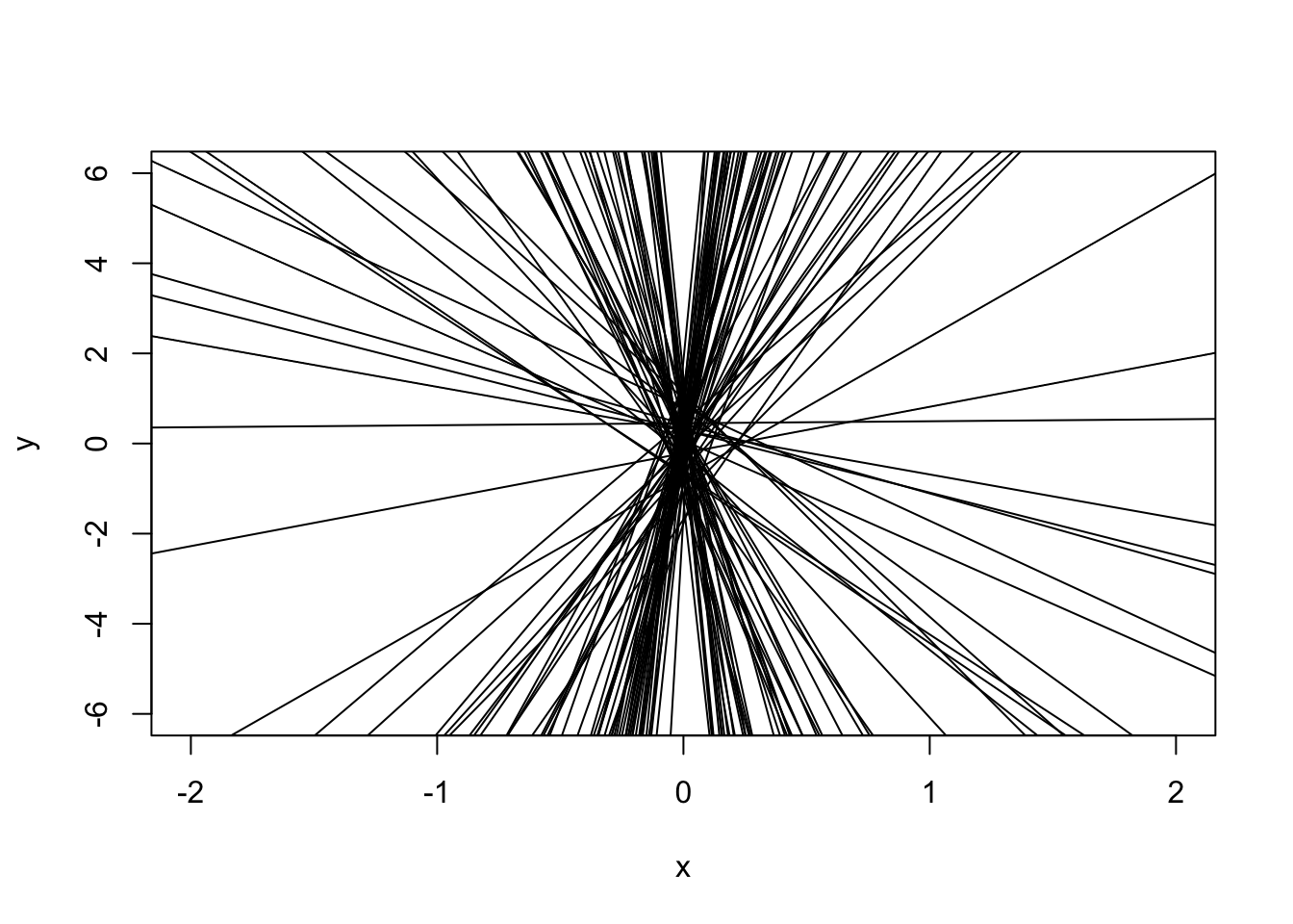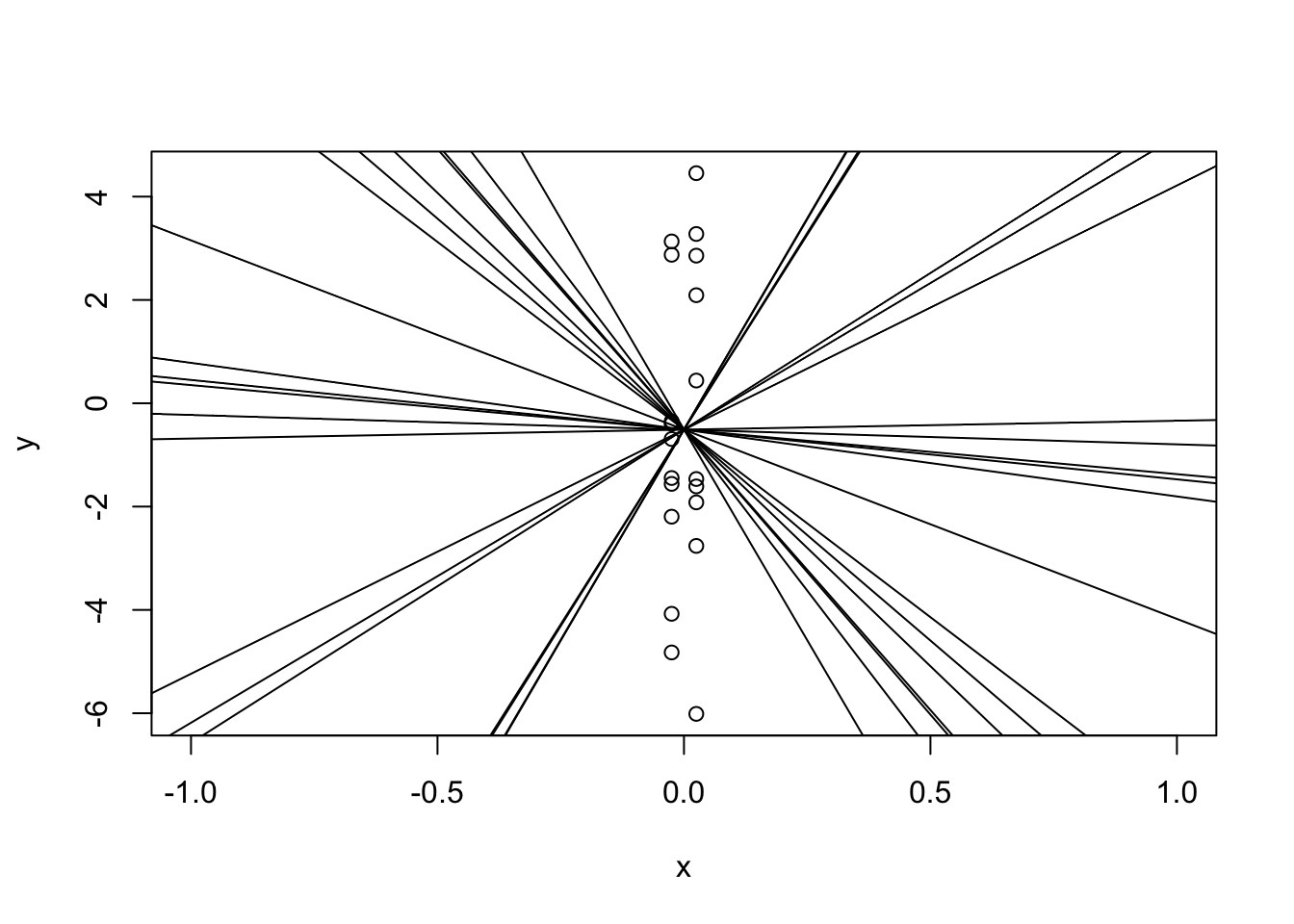 for(i in 1:20) abline(a = mean(y), b = runif(1, -20, 20))